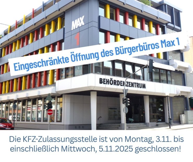 Die Stadtverwaltung Zweibrücken bittet um Verständnis dafür, dass das Bürgerbüro im Behördenzentrum Maxstraße 1 von Montag, 3.11.2025 bis einschl. Mittwoch, 5.11.2025 nur eingeschränkt geöffnet ist: Die KFZ-Zulassungsstelle bleibt aufgrund einer Systemumstellung an diesen Tagen geschlossen. Das Einwohnermeldeamt hingegen ist für den Publikumsverkehr während der regulären Sprechzeiten wie gewohnt geöffnet. Das Onlineportal für Terminvereinbarungen steht im genannten Zeitraum ebenfalls nicht zur Verfügung. Termine können allerdings telefonisch unter der Nr. 06332/871-334 oder über die E-Mail-Adresse buergerbuero@zweibruecken.de vereinbart werden. Das Kultur- und Verkehrsamt (Tourist-Information und Ticketverkauf) ist von den Einschränkungen nicht betroffen.