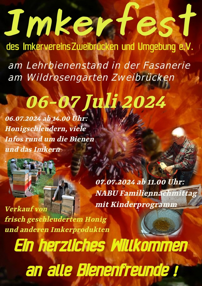 Der Imkerverein Zweibrücken und Umgebung e.V. lädt herzlich zum jährlichen Imkerfest am 06. und 07. Juli 2024 am Lehrbienenstand in der Fasanerie am Wildrosengarten in Zweibrücken ein.
