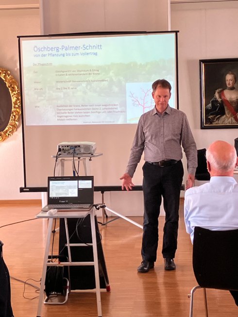 Ab 14 Uhr stellte Roland Loch, der Vorsitzende des Obstbauvereins 1910 Wattweiler, den Obstbaumschnitt nach Öschberg-Palmer vor. Herr Loch erklärt, wie man durch regelmäßigen Schnitt und Pflege hochwertiges Obst und einen guten Ertrag erhält.