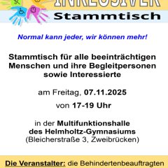 Am Freitag, den 7. November 2025, findet von 17 bis 19 Uhr in der Multifunktionshalle des Helmholtz-Gymnasiums Zweibrücken ein besonderer Stammtisch statt: Eingeladen sind alle Menschen mit Beeinträchtigung, ihre Begleitpersonen und Interessierte.