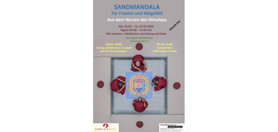 Fünf buddhistische Mönche aus der Himalayaregion in Ladakh / Nordindien werden in einem Zeitraum von sechs Tagen ein traditionelles Sandmandala anfertigen. Im Herzogsaal Zweibrücken haben Interessierte vom 2. bis 7. März die Gelegenheit, den Mönchen bei der Entstehung des Mandalas über die Schulter zu schauen und das tägliche Fortschreiten zu beobachten. In diesen für unsere Welt herausfordernden Zeiten widmet sich die Peace Mandala Tour, die vom Himalaya-Haus e.V., Deutschland organisiert wird. der Vermittlung zeitloser Werte wie Liebe, Mitgefühl, Weisheit, Frieden und Einheit. Lokale Partner der Aktion sind Tina Sanio von „Nachhaltig wirken“ und die Stadtbücherei Zweibrücken.