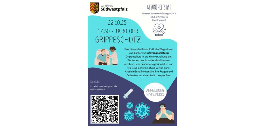 Diese findet am Mittwoch, 22. Oktober, um 17.30 Uhr im Kreistagssaal der Kreisverwaltung in Pirmasens statt. Die Bürgerinnen und Bürger lernen das Krankheitsbild kennen, erfahren, wer besonders gefährdet ist und wie eine Schutzimpfung gegen Grippe wirken kann. Im Anschluss wird eine kurze Fragerunde mit einer Amtsärztin angeboten. Die Veranstaltung dauert etwa eine Stunde. Die Veranstaltung ist kostenfrei. Das Gesundheitsamt bittet um vorherige Anmeldung bis zum 20. Oktober per Mail an i.kost@lksuedwestpfalz.de, telefonisch unter 06331-809395 oder unter folgendem Link: