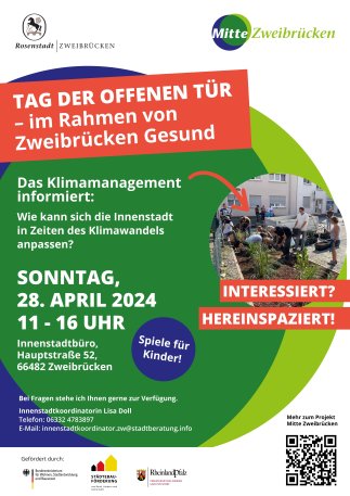Die Innenstadtkoordination beteiligt sich mit einem Programm am Aktionstag "Zweibrücken Gesund". Neben Informationen darüber, wie sich die Innenstadt in Zeiten des Klimawandels anpassen kann, steht das Klimamanagement Rede und Antwort. Auch für Kinder gibt es ein großes Spielangebot im Kontext der Klimawandelanpassung. Wir freuen uns Sie in der Hauptstraße 52 begrüßen zu können.