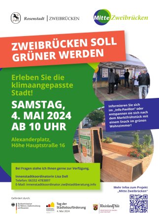 Anlässlich zum Tag der Städtebauförderung am 4. Mai finden Sie uns auf dem Alexanderplatz. Unter dem Motto "Zweibrücken soll grüner werden" stellt die Innenstadtkoordination und das Klimamanagement der Stadt mögliche Maßnahmen der Begrünung und der Klimawandelanpassung vor. Es werden auch Snacks der Bäckerei Leiner angeboten, die Sie im grünen Wohnzimmer genießen können. Auch für Kinder werden kurzweilige Klimaspiele angeboten. Gegen Ende der Veranstaltung werden die Pflänzchen des grünen Wohnzimmers verschenkt, so soll Zweibrücken grüner werden. Wir freuen uns, wenn Sie bei uns vorbei kommen.
