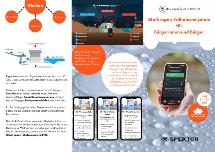 Seit dem 21. Juli 2023 ist das Starkregen-Frühalarmsystem (FAS) der Stadt Zweibrücken als App für Android und Apple verfügbar. Das FAS misst in Echtzeit Niederschläge, Pegelstände an Bächen und Gräben, sowie Wasserstände in Kanälen. Alle Informationen sind in einem aktuellen Informationsflyer zusammengefasst.