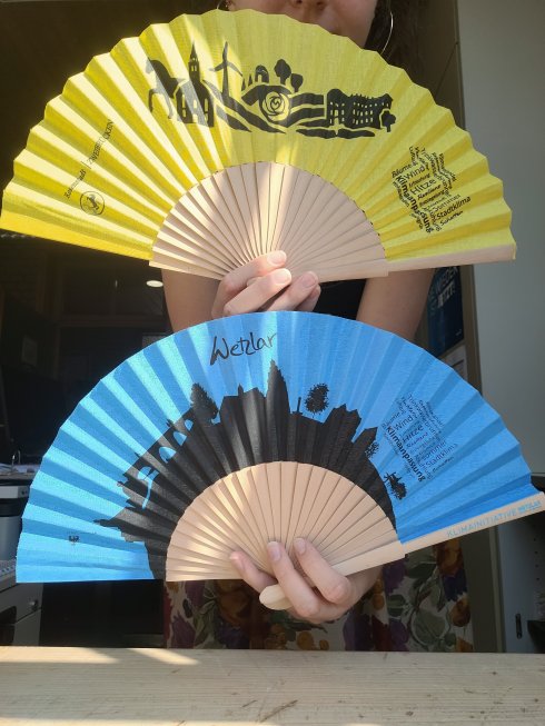 Thomas Batinic, der Klimaanpassungsmanager von Wetzlar, entwarf beispielsweise für seine Kommune einen Prototypen des nachhaltig beschafften Klimafächers. Zweibrücken hat das Layout und die Klimaanpassungs-Wortwolke ("Hitze", "Stadtklima", "Wind") übernommen und die Klimagrafik als zentrales Element hinzugefügt - fertig war das Design des praktischen Holzfächers für heiße Tage.